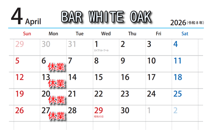 【2026年4月の営業日お知らせ】銀座のウイスキーバー|BARWHITEOAK